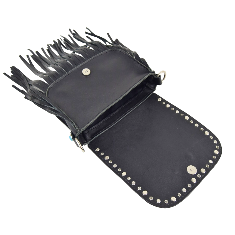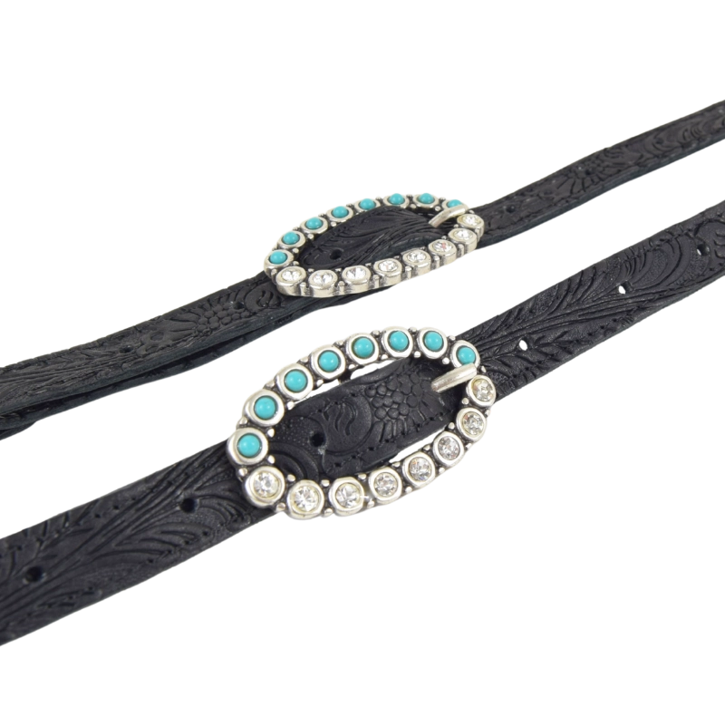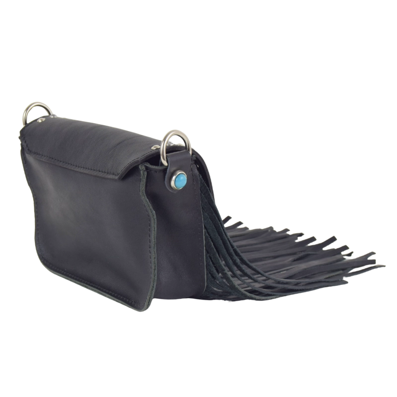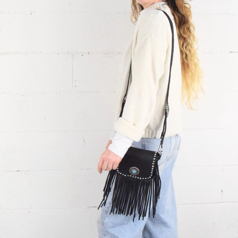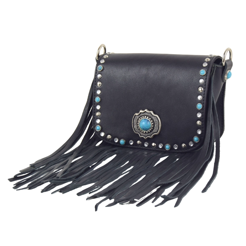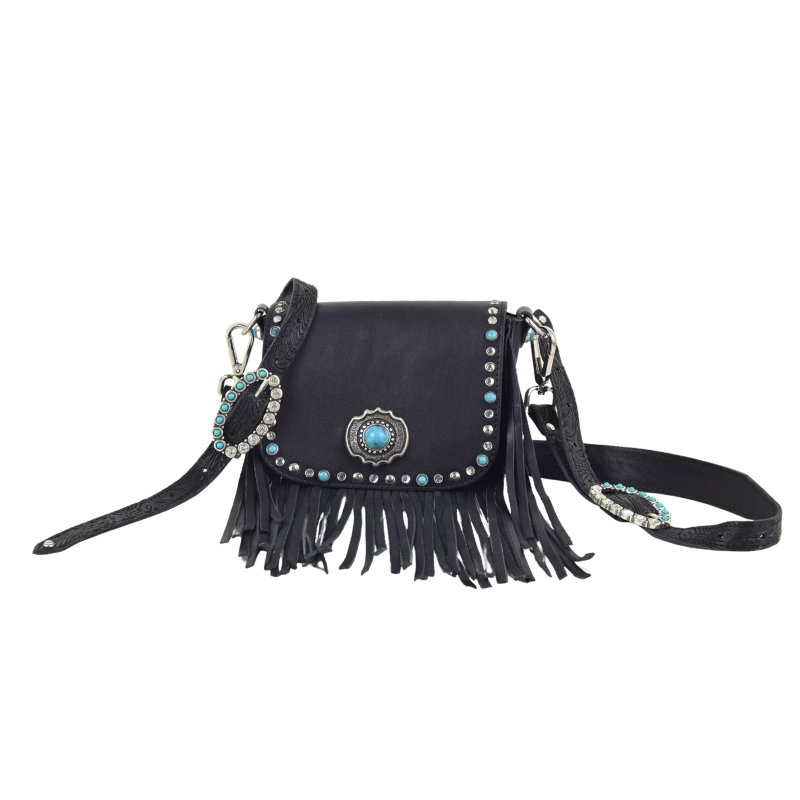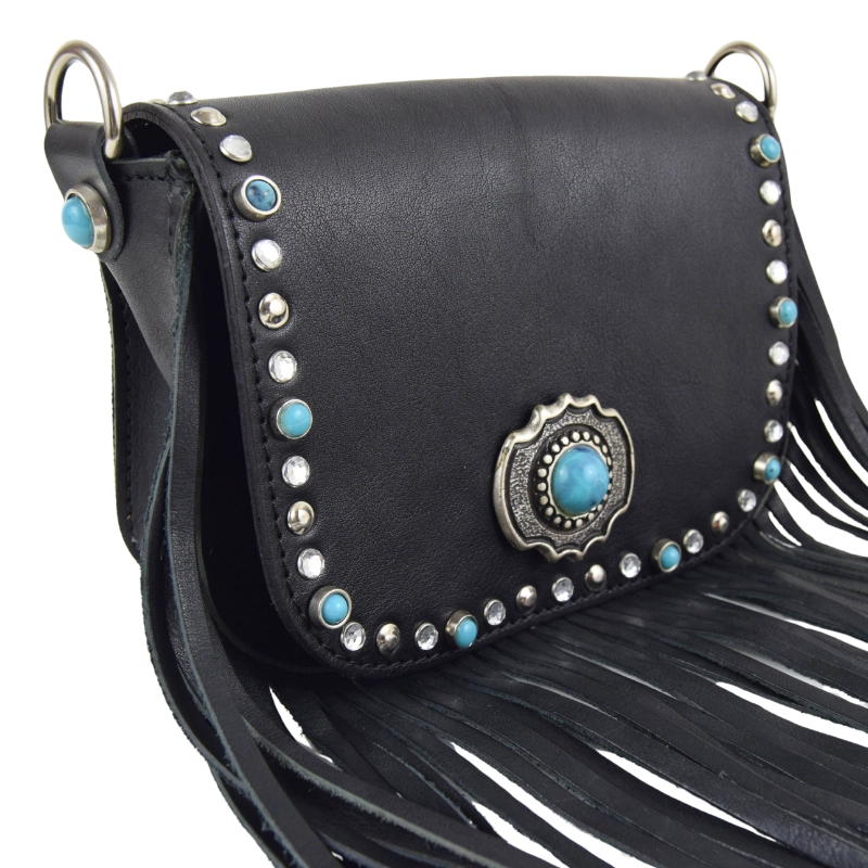 Borsetta in stile western impreziosita con strass e turchesi, gli stessi che ritroviamo anche sulle meravigliose fibbie gioiello che adornano la tracolla, stampata a fuoco con motivi floreali. Una borsa compatta e perfetta per dare un tocco country chic al tuo look.