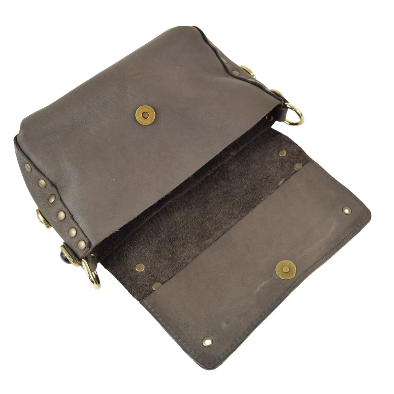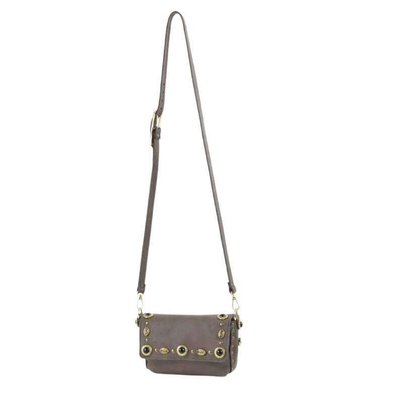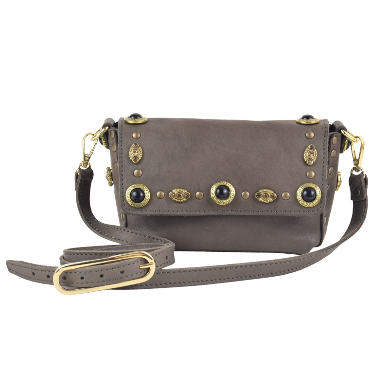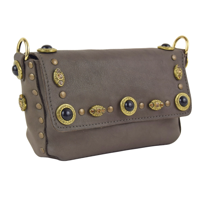 Borsa in pelle impreziosita da eleganti simil pietre onice e strass color caramello, perfetti per dare un tocco di luce al tuo look.