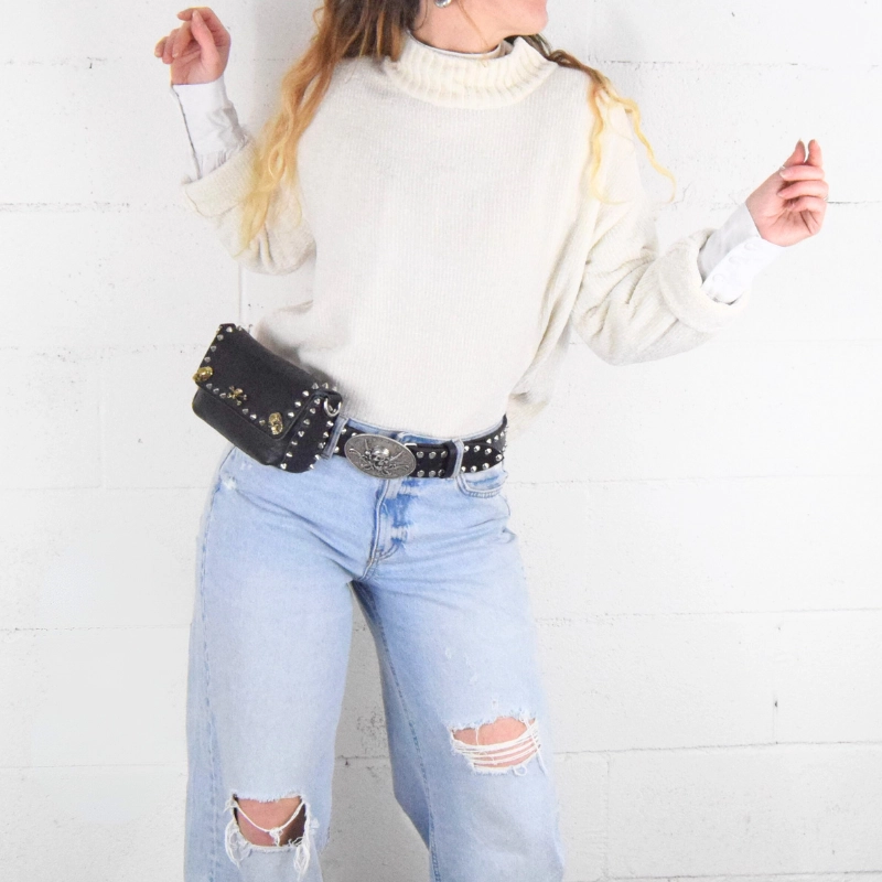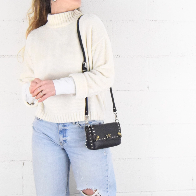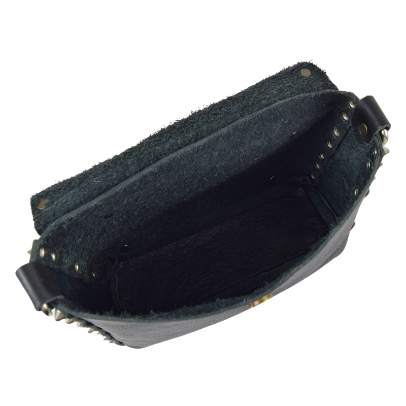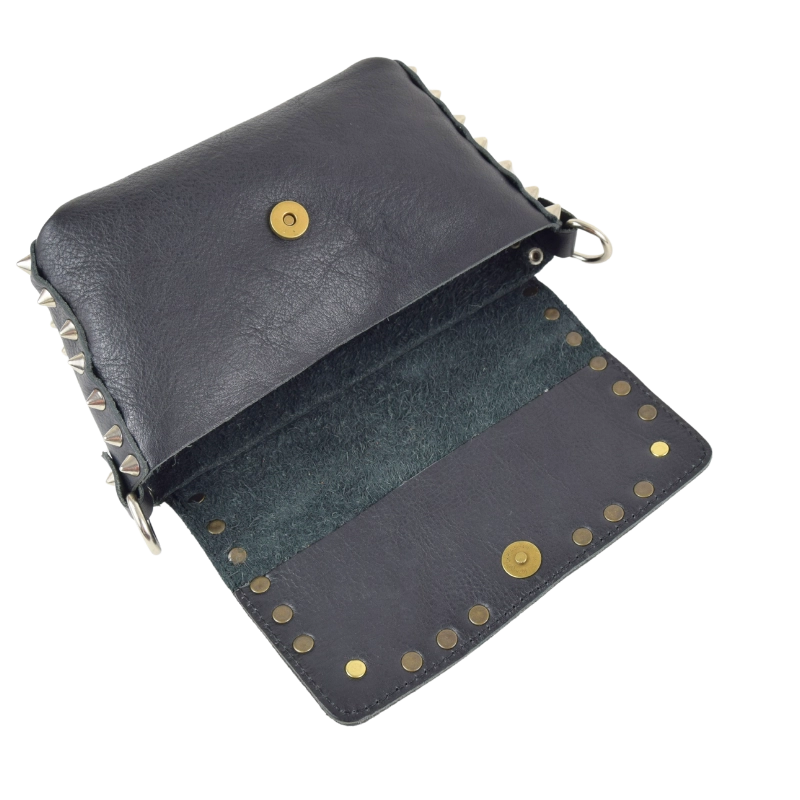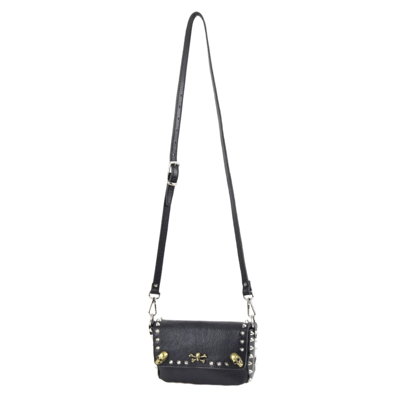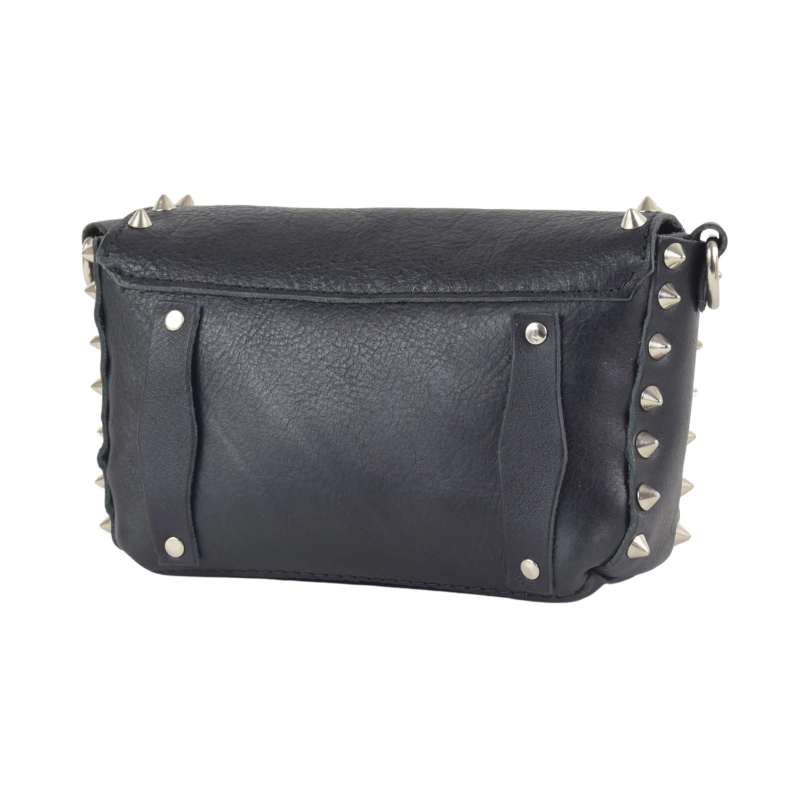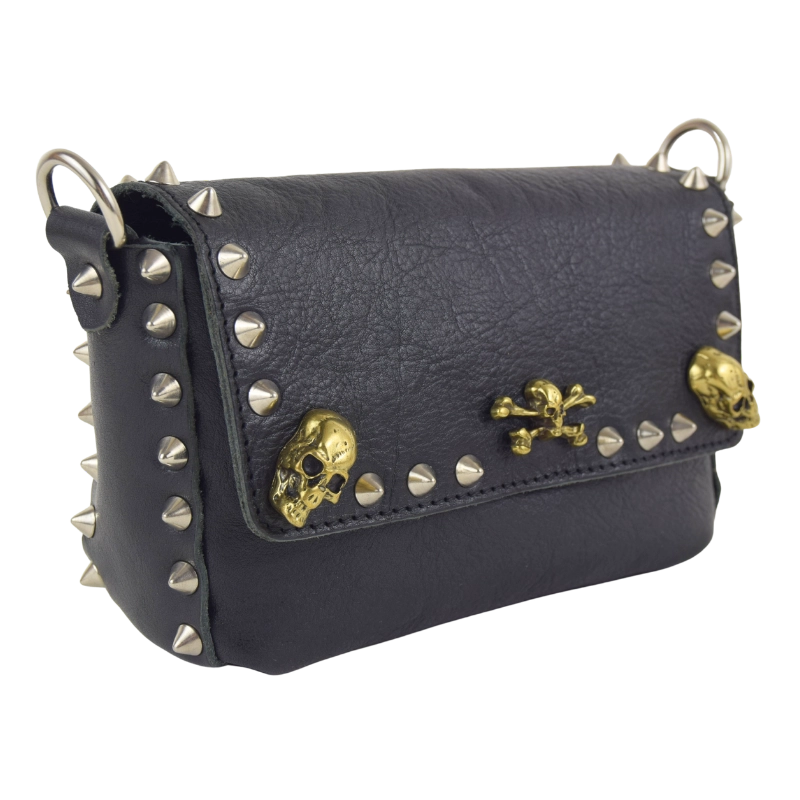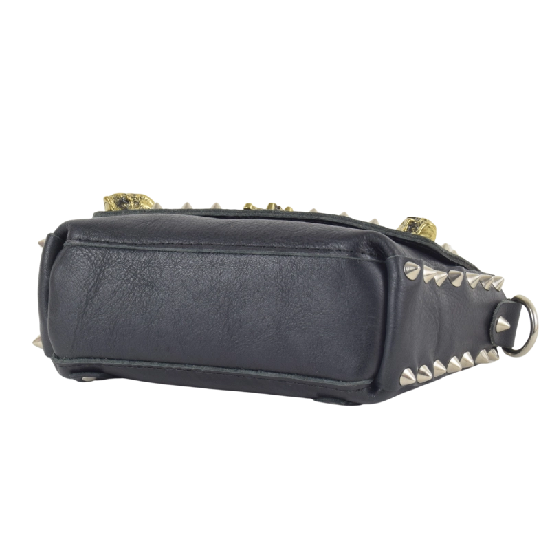 Borsetta in pelle borchiata interamente a mano nel mio laboratorio e impreziosita con borchie a forma di teschio. Piccola, ma sorprendentemente capiente, questa borsa è perfetta per dare un tocco rock al tuo look, senza rinunciare a nulla.