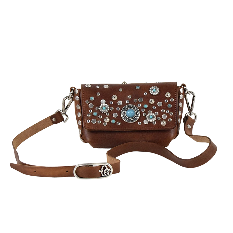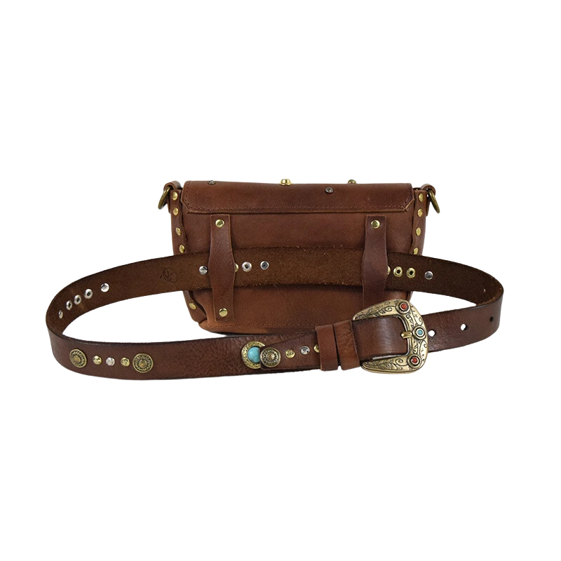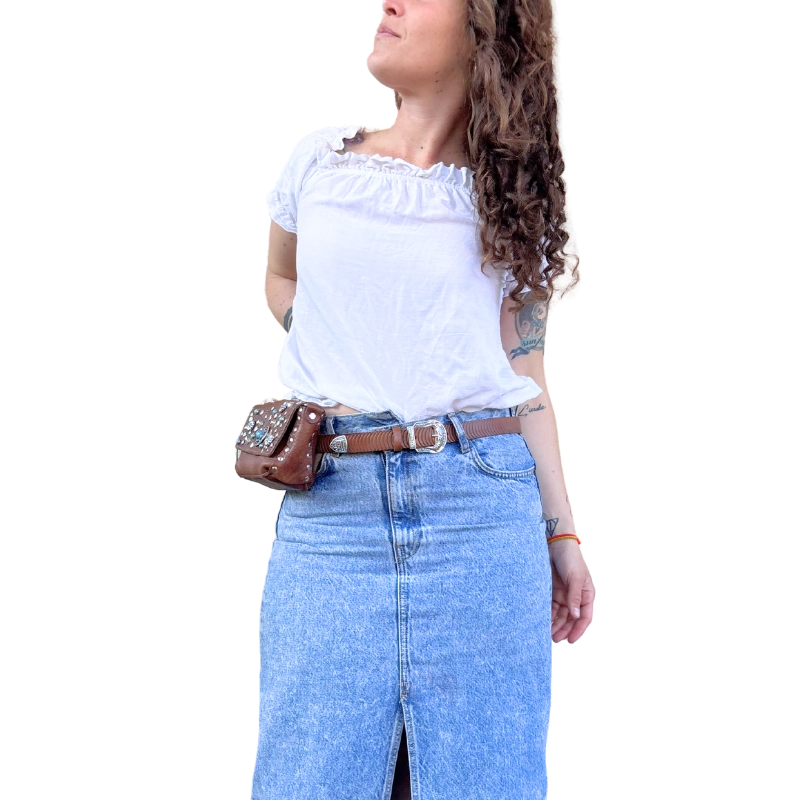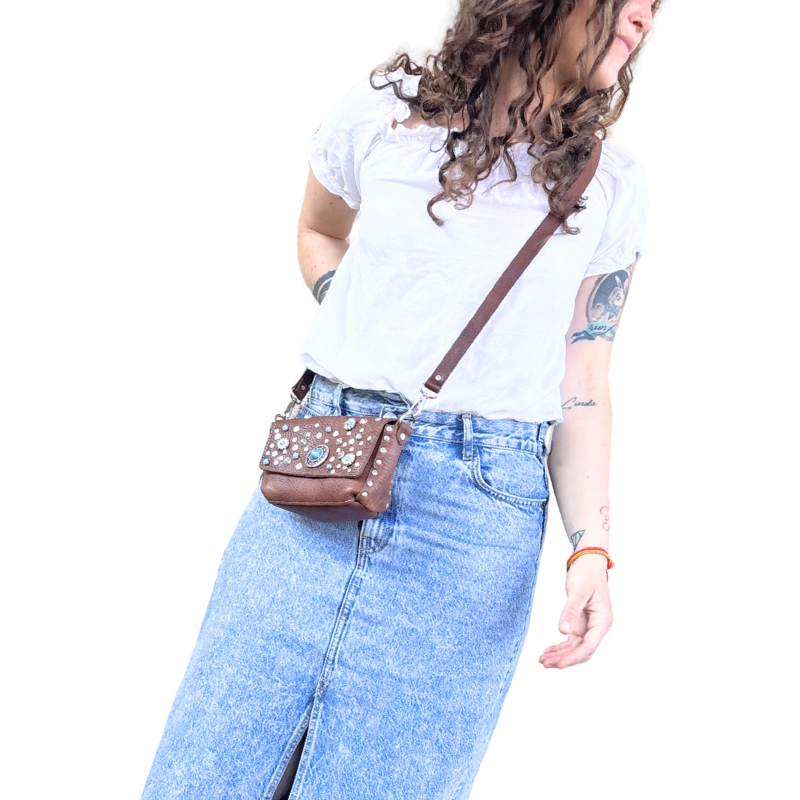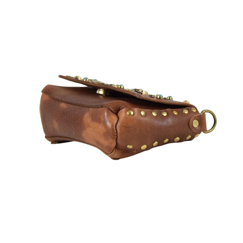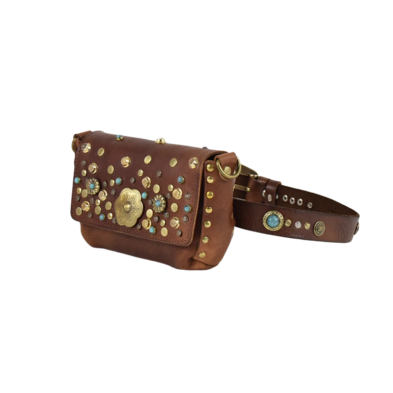 Borchiata interamente a mano e impreziosita da simil pietre color turchese, questa borsina è pratica e versatile. Infatti puoi decidere se portarla a tracolla o a modi marsupio infilando la tua cintura preferita nei passanti che trovi sul retro.