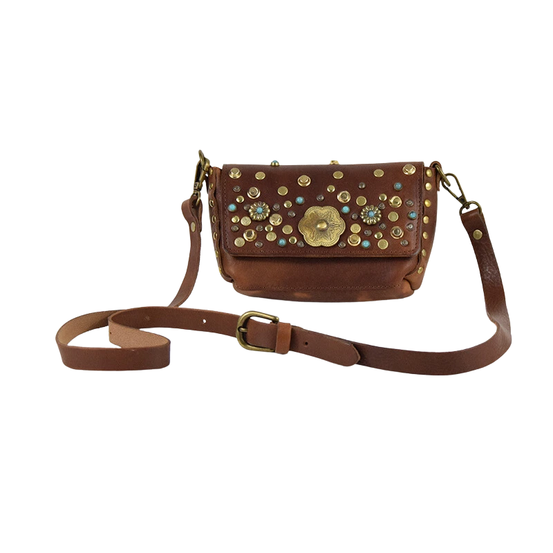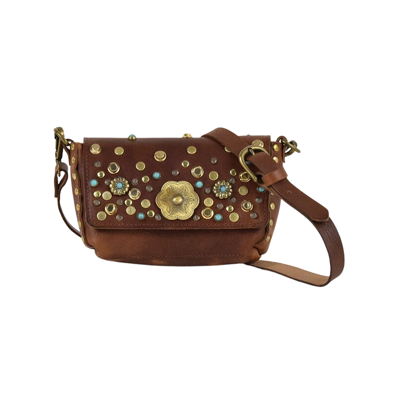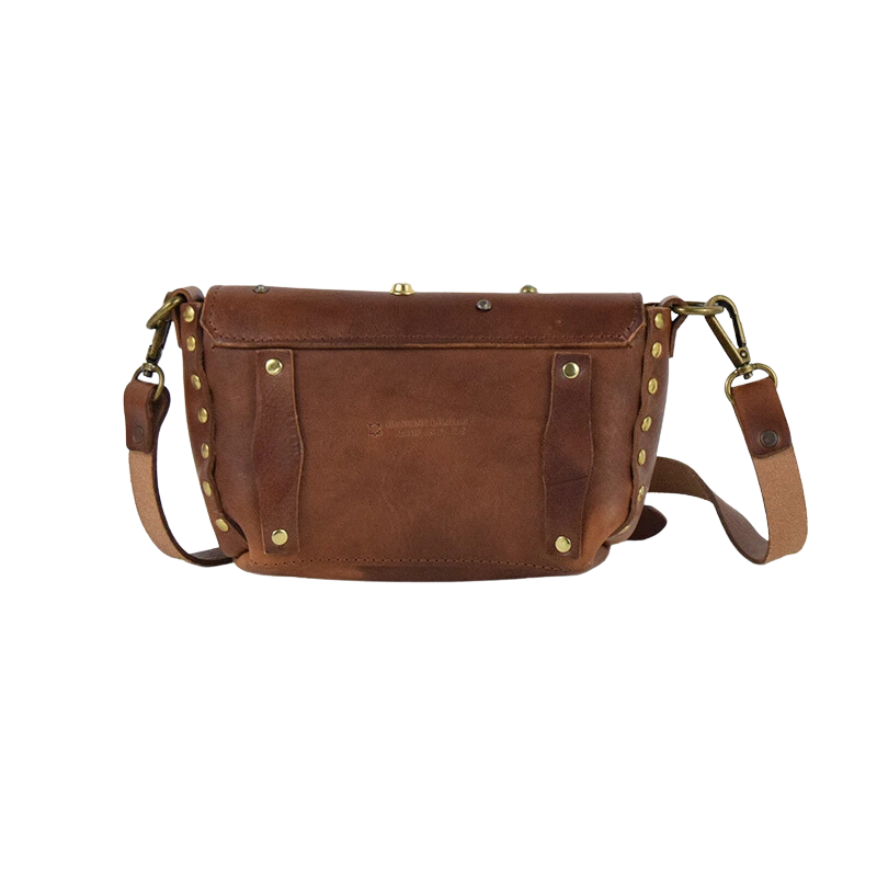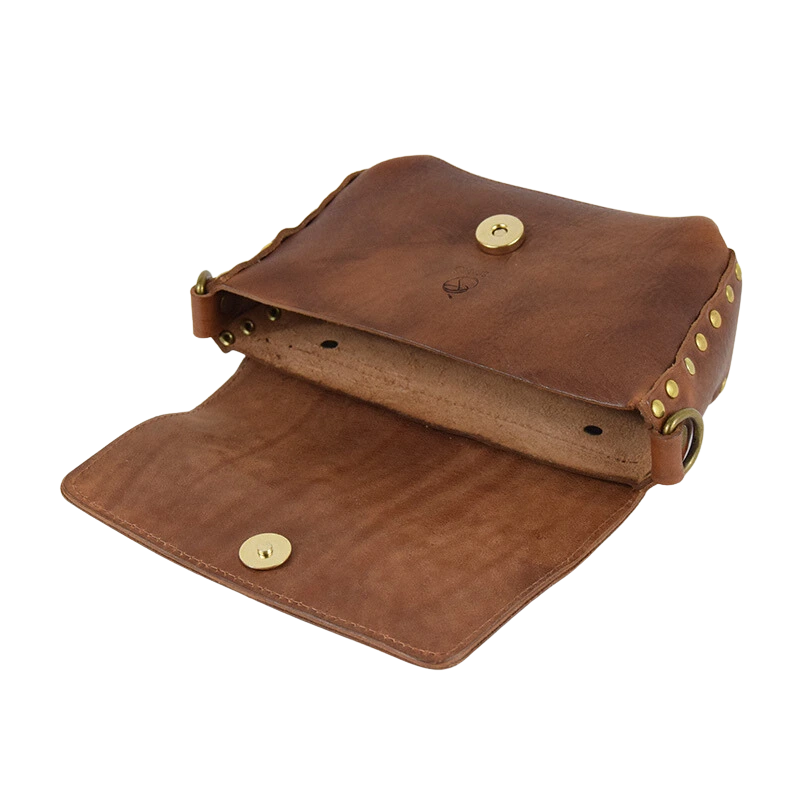 Borsa in cuoio borchiata dalle piccole dimensioni, ma sorprendentemente capiente, ideale per portare con te tutto il necessario senza rinunciare al tuo stile.