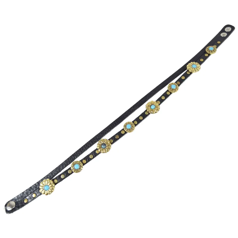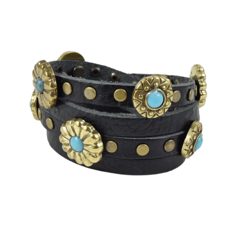 Bracciale in pelle a doppio giro, nel classico colore del nero, e impreziosito da simil pietre turchesi che risaltano con il loro bellissimo colore.