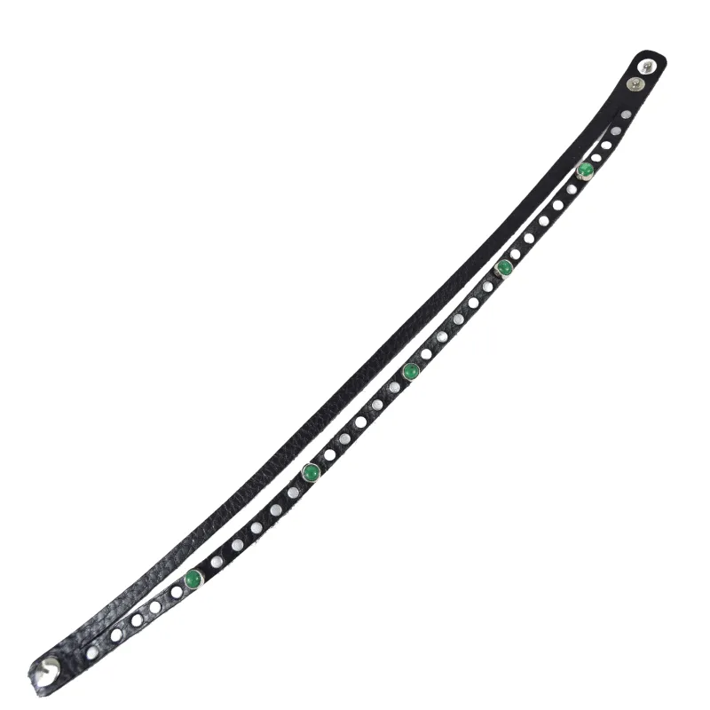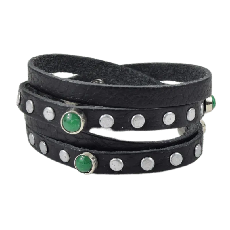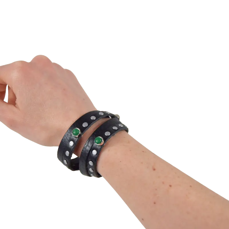 Bracciale in pelle a doppio giro borchiato con simil pietre verdi e borchie argento, ideale se vuoi dare un tocco di colore al tuo look.