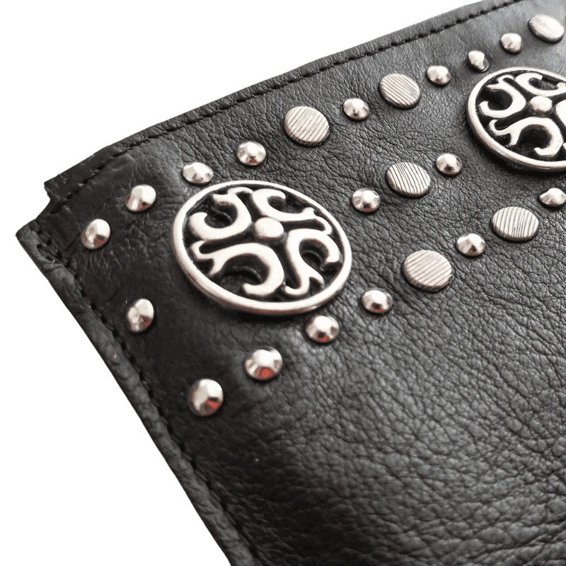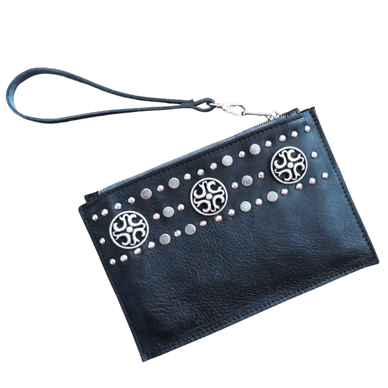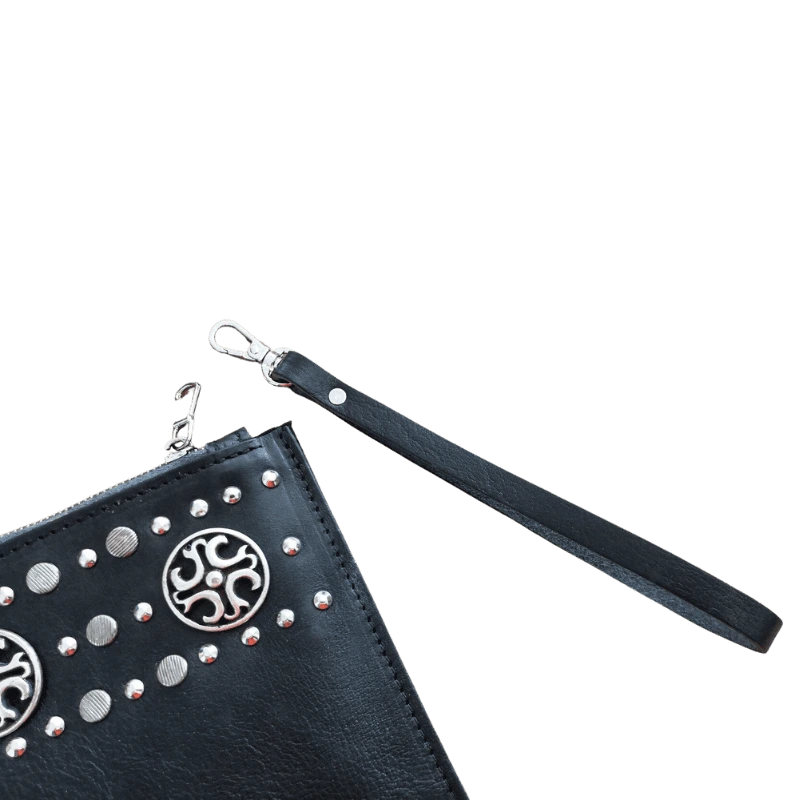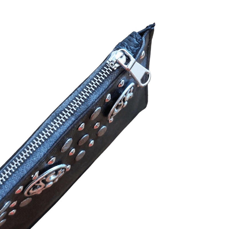 Bustina in pelle borchiata interamente a mano con borchie lavorate. Dalle piccoli dimensioni, ma utile per conservare ciò che più tieni come medicinali, documenti, o tanto altro!