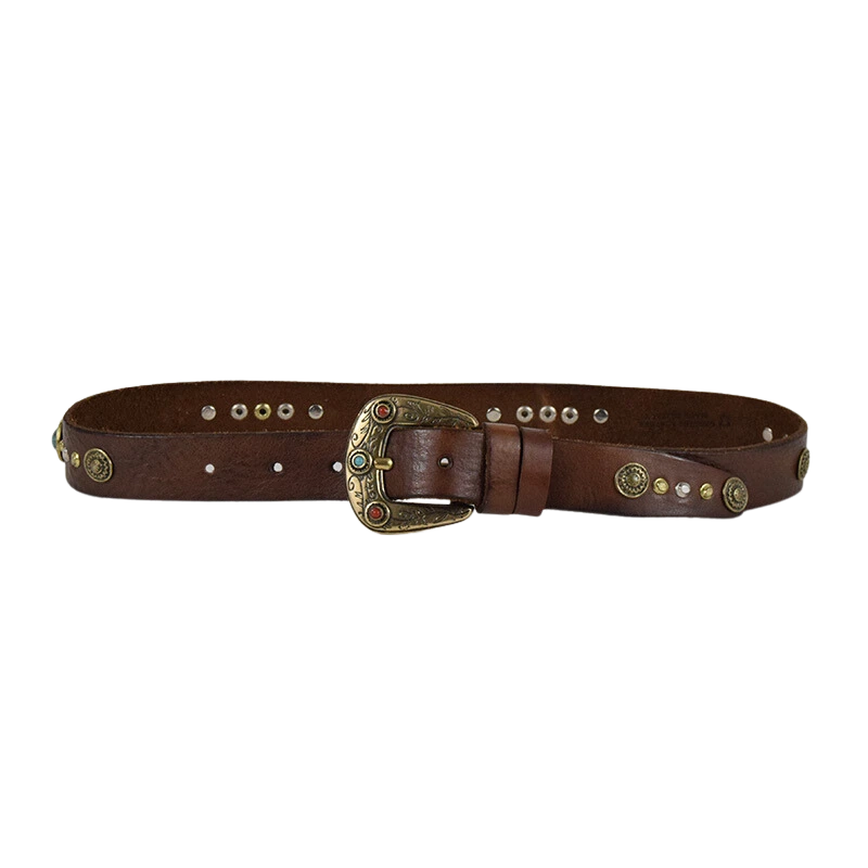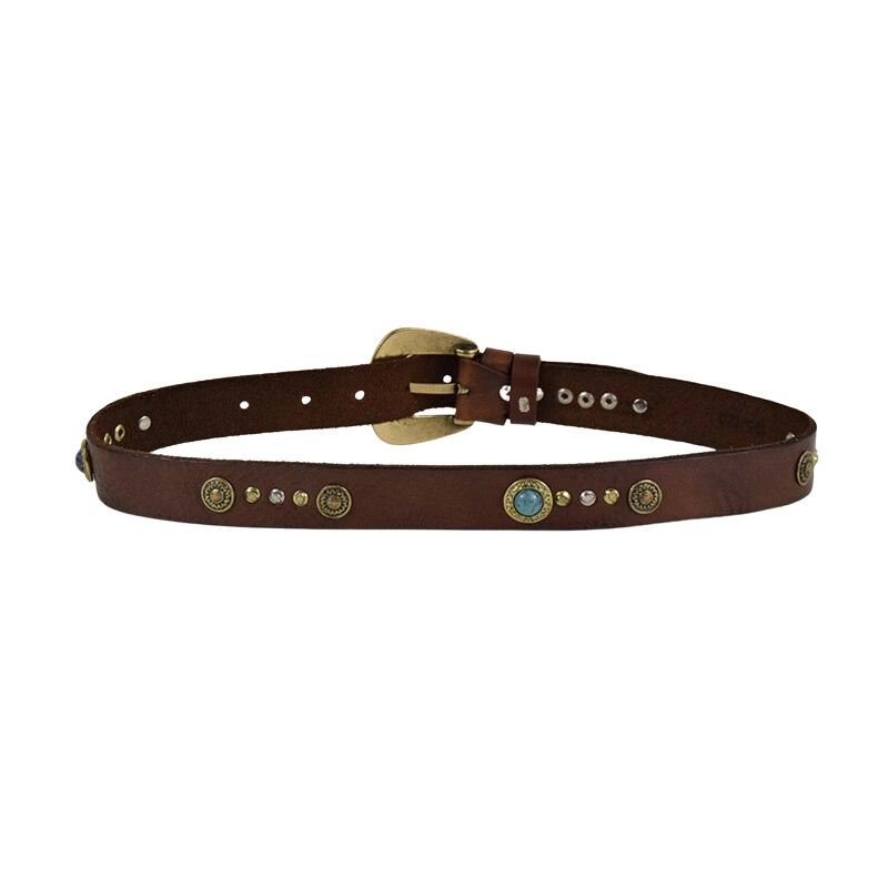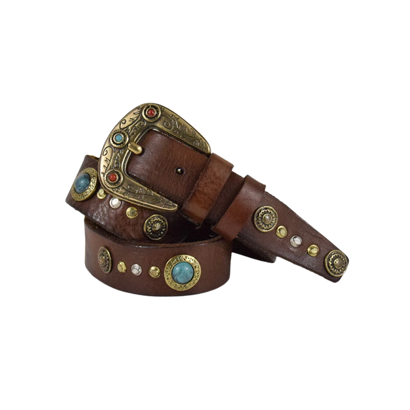 Cintura in cuoio impreziosita da simil pietre turchesi che ritroviamo anche sulla fibbia, arrotondata e arricchita da incisioni floreali. Indossala con i tuoi jeans, per dare un tocco county al tuo outfit.