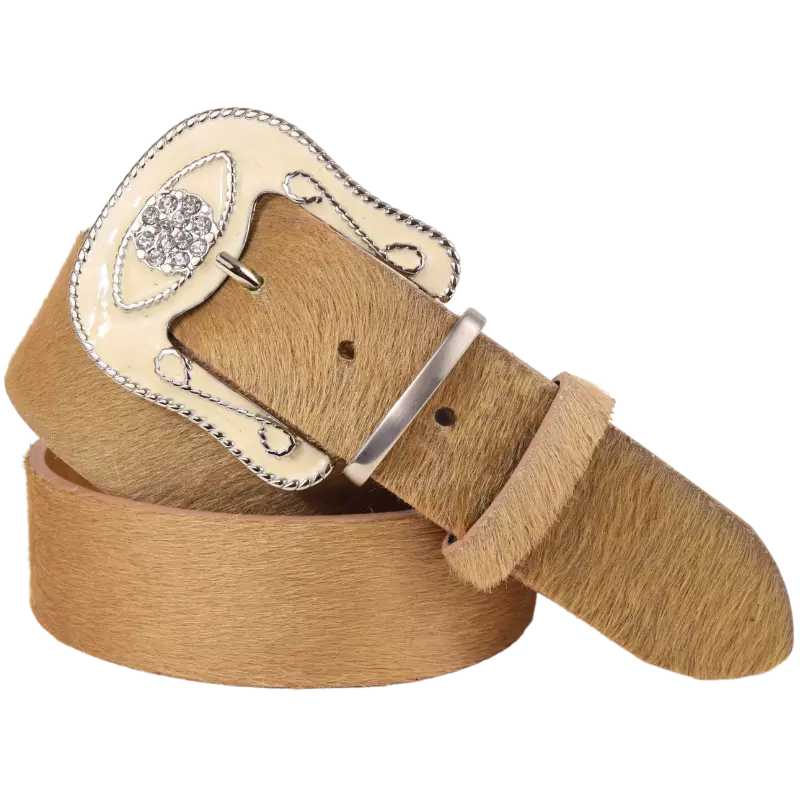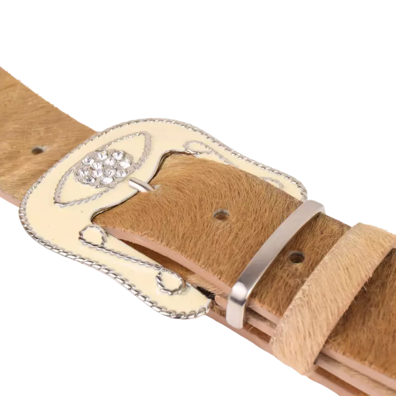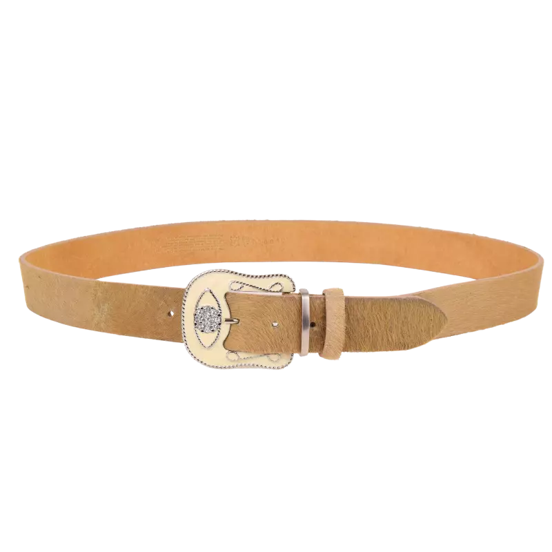 Cintura in cavallino sui toni chiari del beige, abbinata ad una fibbia in stile western, verniciata in color crema e tempestata di strass luminosi. Perfetta su un paio di jeans, una bella camicia bianca e i tuoi camperos preferiti.