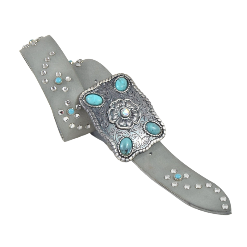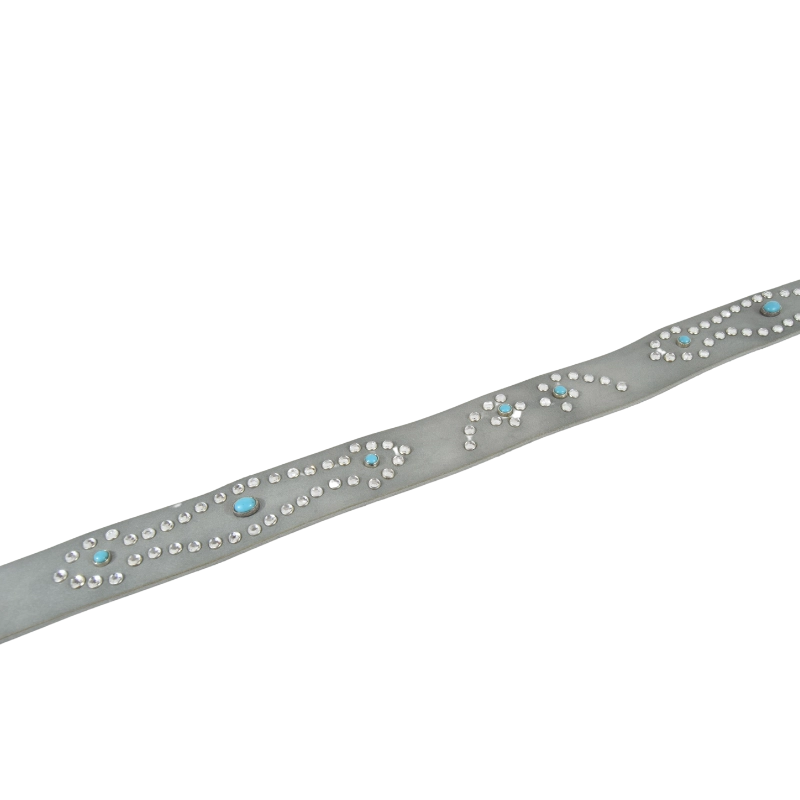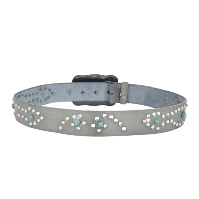 Cintura in cuoio riessente e dai colori tenui del grigio. Impreziosita con strass e simil pietre turchesi è perfetta da indossare con i tuoi jeans preferiti per dare un tocco western e luminoso al tuo look.
