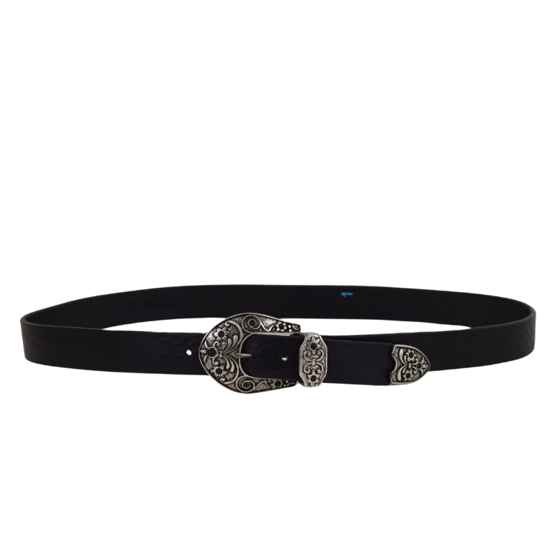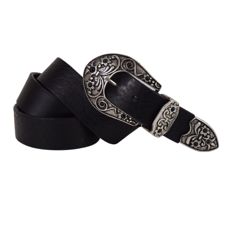 Cintura in cuoio dalle linee semplici, ma impreziosita da un particolare trittico con incastonate simil pietre onice che la rendono preziosa. L’accessorio perfetto da indossare con i tuoi jeans preferiti per dare un tocco western al tuo look.
